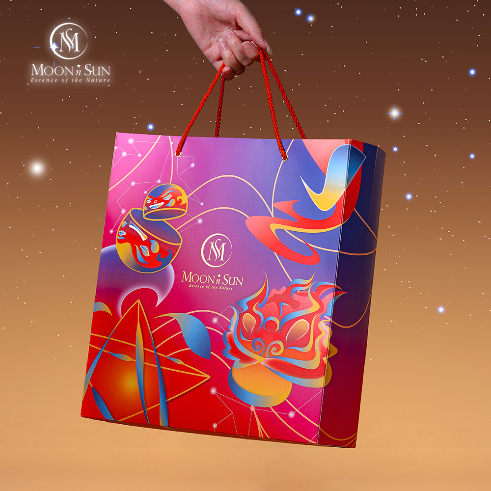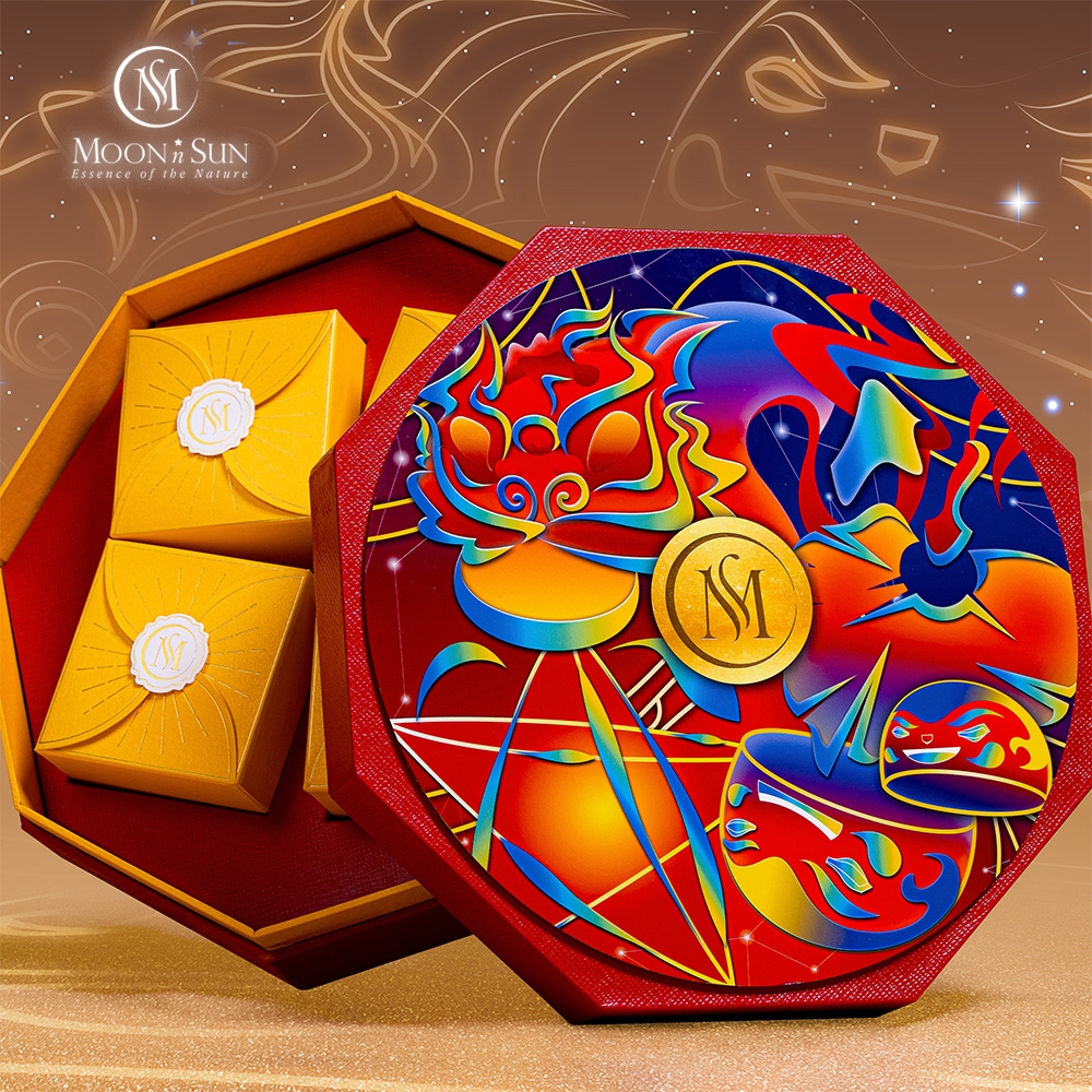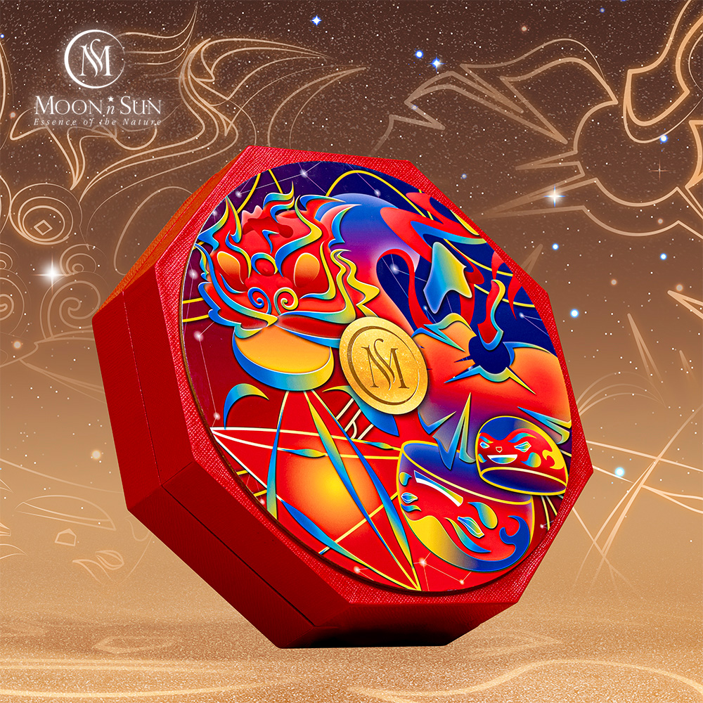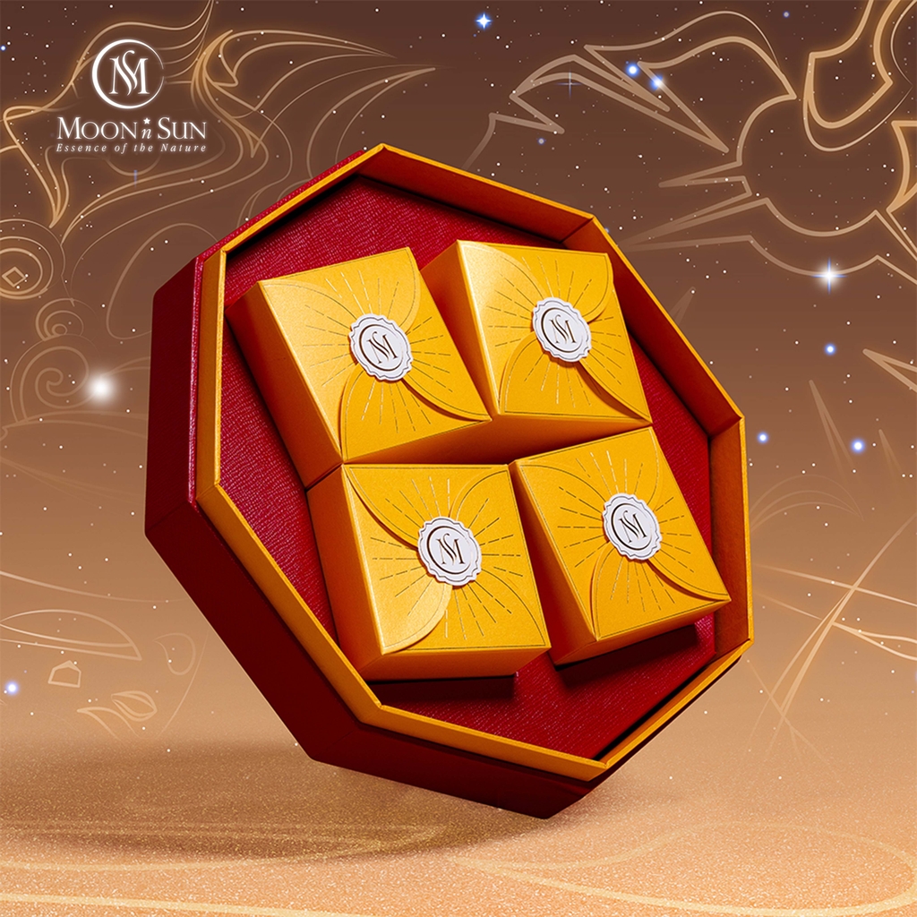 Hộp carton bát giác bồi giấy mỹ thuật màu đỏ giả da cao cấp, kết hợp mặt MDF với bộ hoạ tiết “Ánh Sáng Diệu Kỳ - Trung thu 2025” của Moon n Sun cùng kỹ thuật phủ bóng hai lớp. Các cạnh mặt được sơn nhũ vàng và logo Moon n Sun dập nhũ chính giữa hộp.