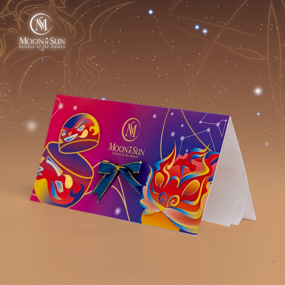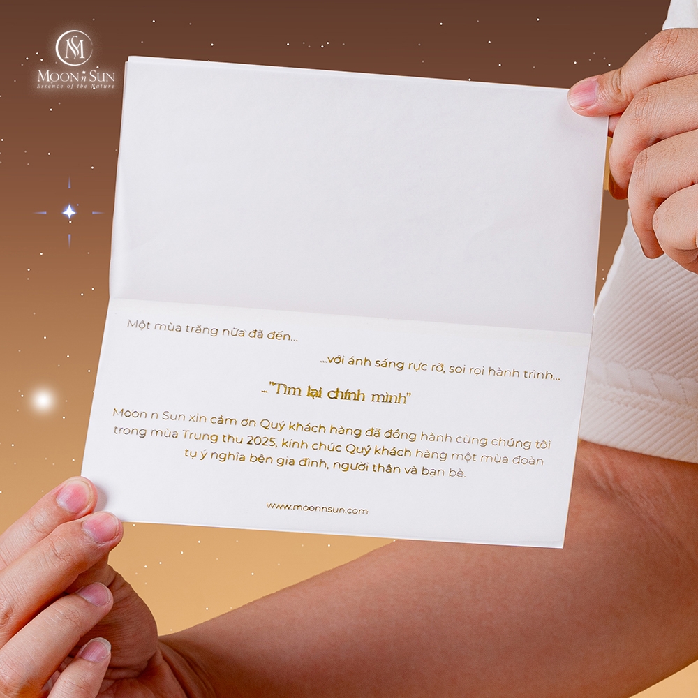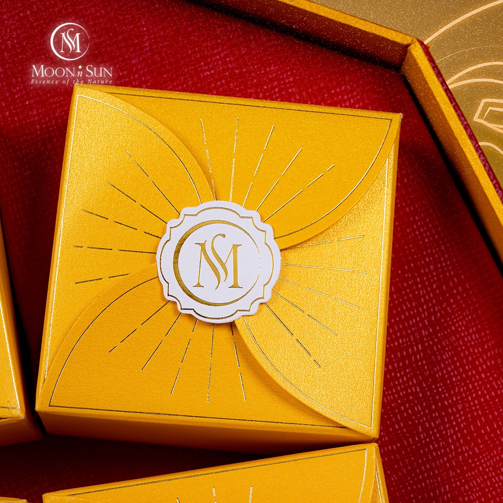 Bên trong gồm 04 cốt carton vuông màu vàng kèm logo Moon n Sun đính giữa, các hoạ tiết được dập nhũ.