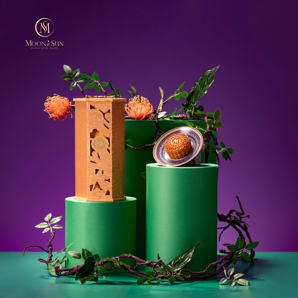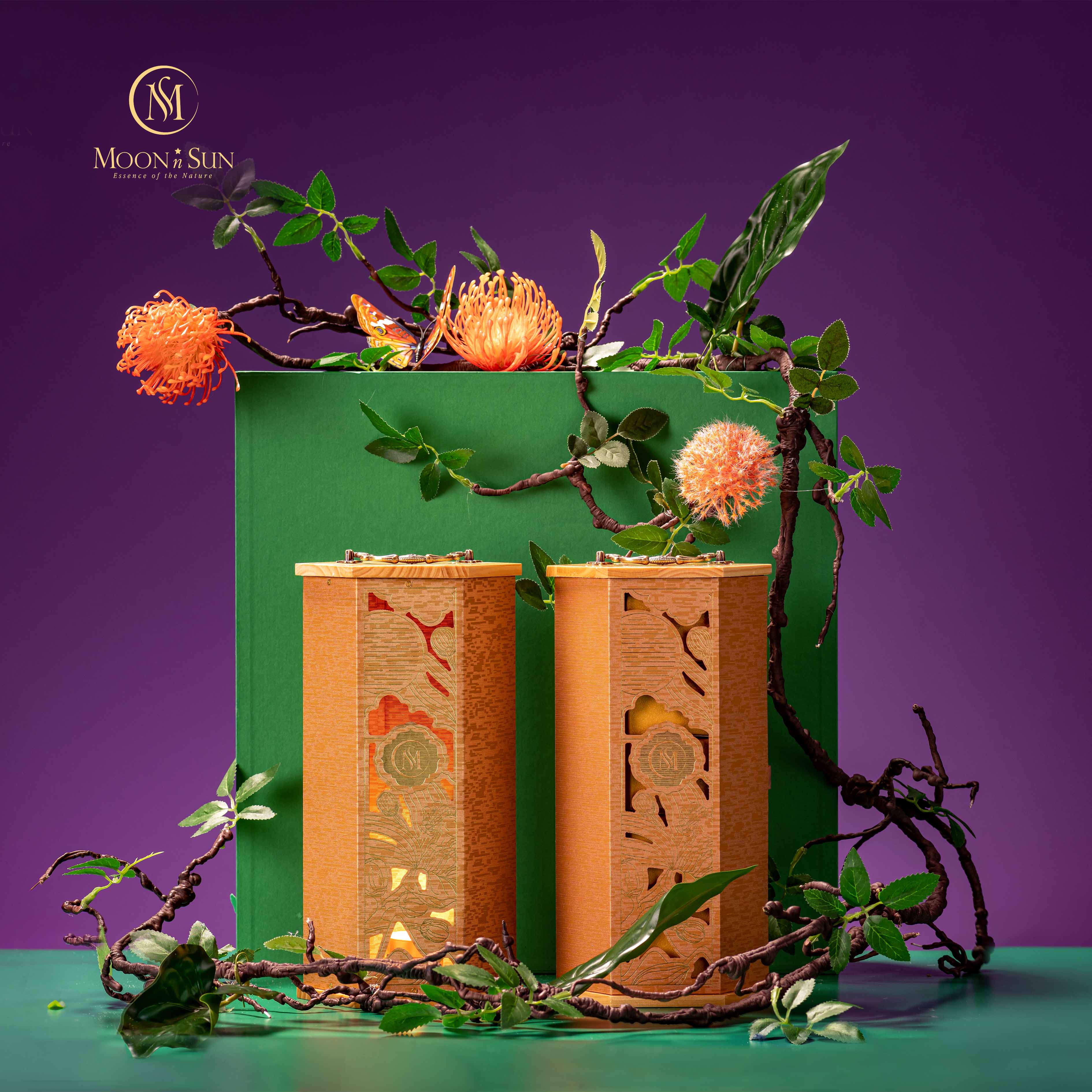 Hộp gỗ hình lục giác kết hợp carton bồi giấy mỹ thuật cao cấp Hàn Quốc, kết cấu dạng mở nắp lồng đèn, thiết kế trổ thủng dập nhũ hoạ tiết và logo Moon n Sun.